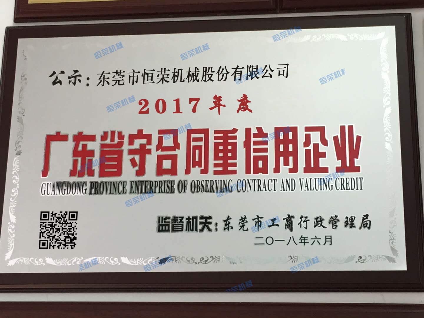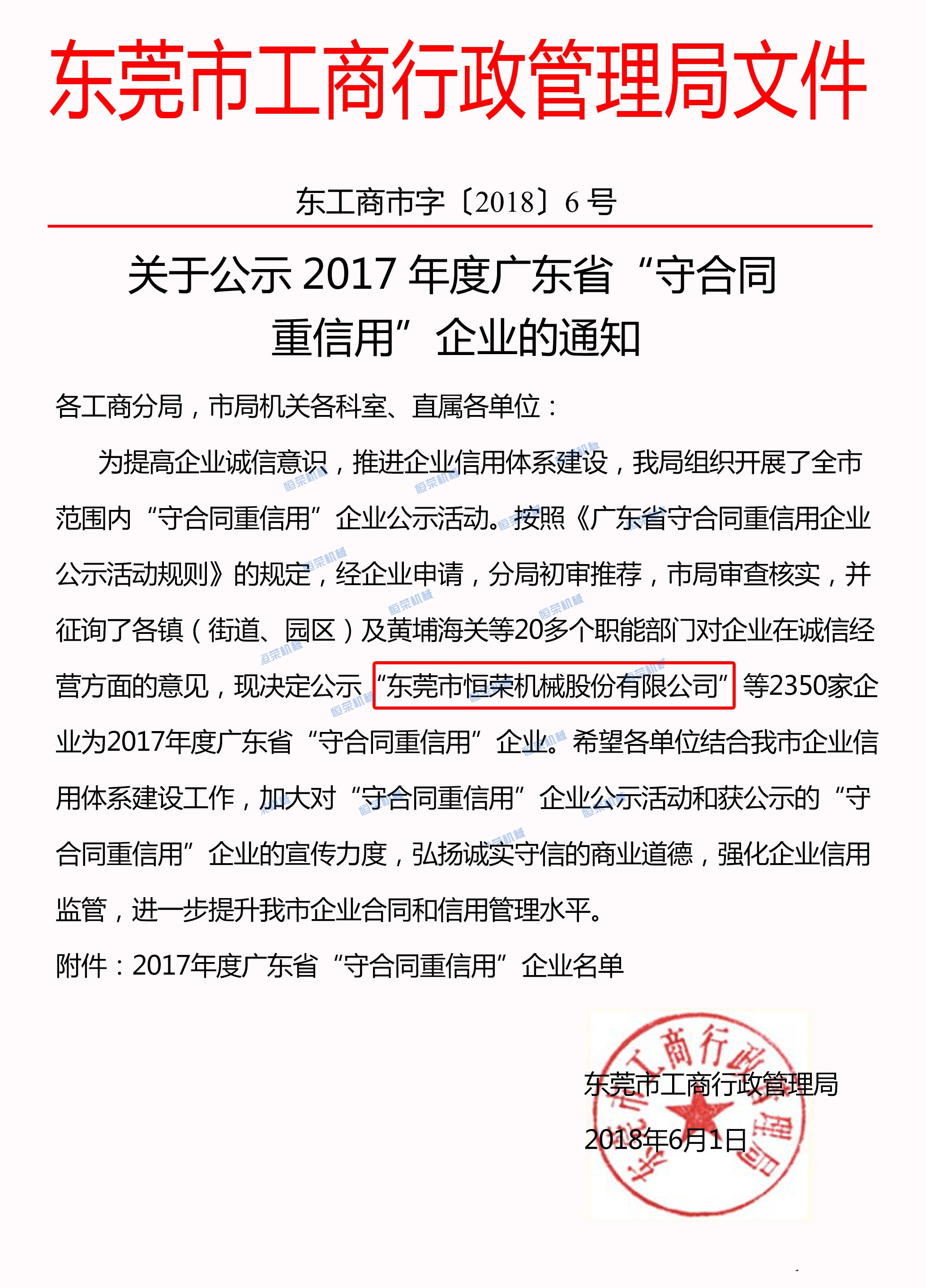 榮獲2017年度東莞市“守合同重信用”企業(yè)稱號,表明了公司誠信建設(shè)得到了政府主管部門和社會各界的高度認(rèn)可,彰顯了公司誠信立企的核心價值觀,展示了公司重信用的良好形象。